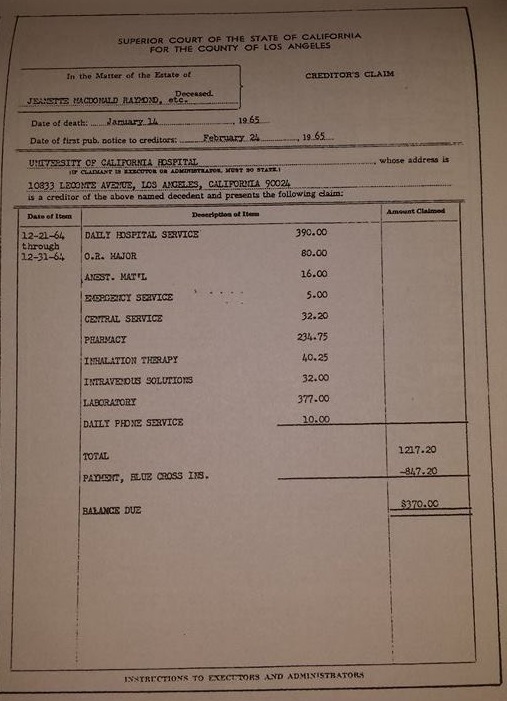 Here is the first item for your consideration—-an unpaid hospital bill from Jeanette’s final stay at UCLA, the last ten days of 1964.