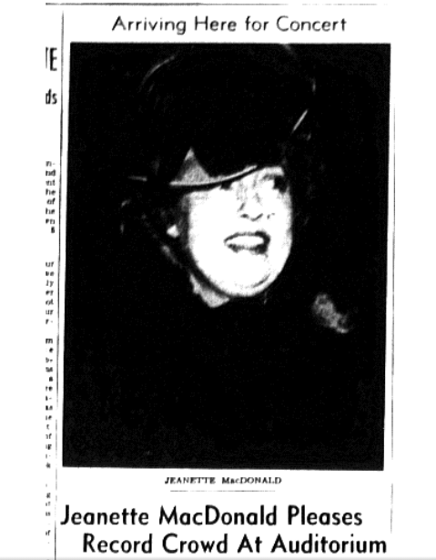 Anyway, it was not unheard of for them to “meet up” on tour. The last time Angela and I were at the LOC (in June), I was working my fingers to the bone in the Newspaper Reading Room, trying to export as many articles as I could get my hands on. Many of them I didn’t even stop and read: if it looked interesting, I grabbed it while the grabbing was good and worried about reading it later. But something that caught my eye mentioned Jeanette making a tour stop in Roanoke, VA, in January of 1941. Roanoke is less than a 40 minute drive from my house, so that was cool, and I made a mental note to look into that, reflecting that Nelson sang for FDR’s inauguration in 1941, and wondering if the dates were similar and if, by chance, the paths (and perhaps, you know, bodies) of our twosome had crossed.