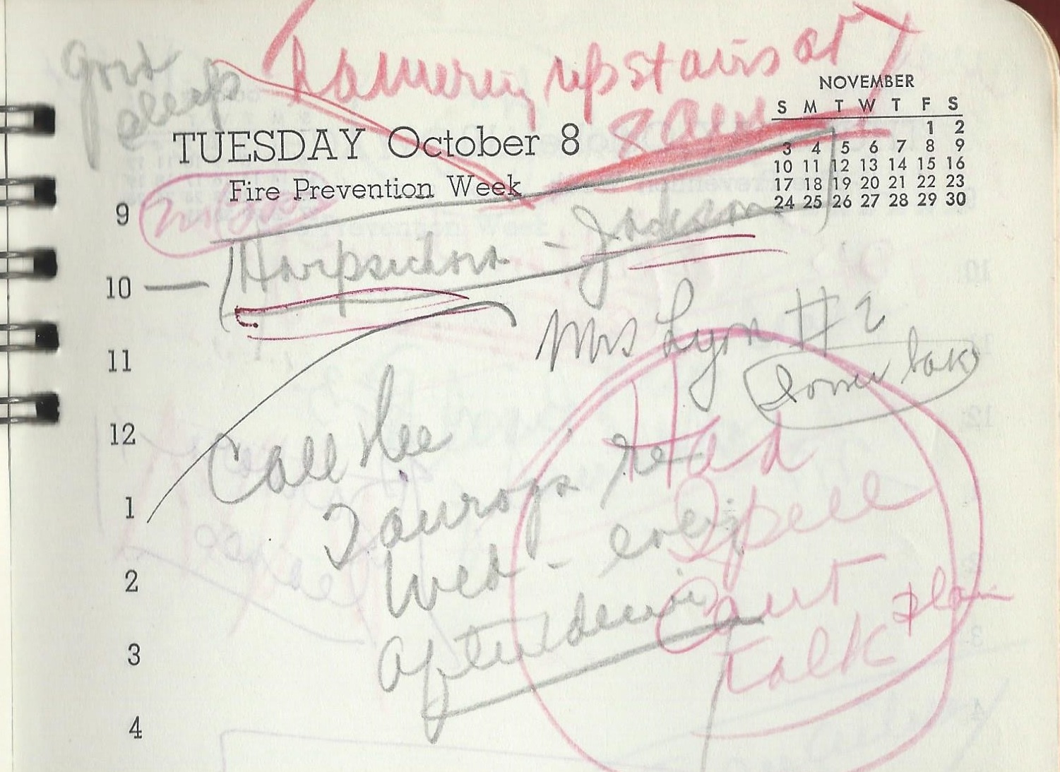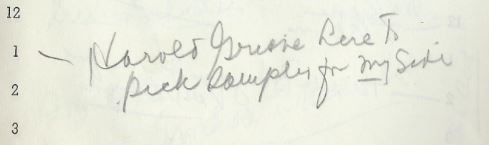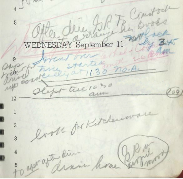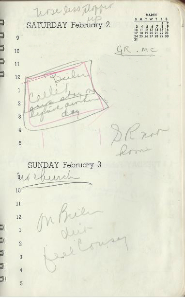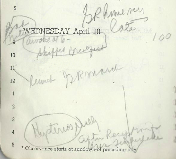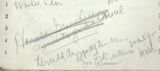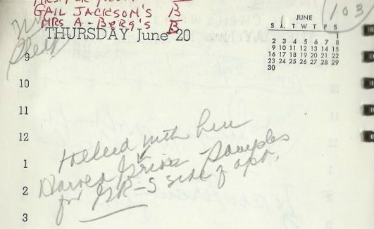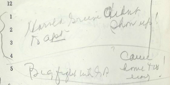 Gene says he’s going to the apartment to “arrange books” but isn’t back as of 3:45AM. He “says he went for a drive up coast” and “I went over twice, started calling at 11:30, no A[nswer]” and “GR in awful mood” …..So he’s lying and defensive about it? That’s what I’m reading, anyway.