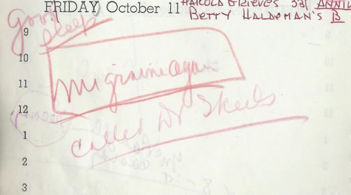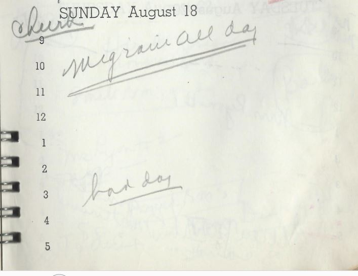 Gene arrived home after being gone a month. She had a migraine that night and TWO migraines the next day. THAT IS NOT GOOD. Those are only a few of the many migraines she had this year. It is known that she had a benign brain tumor, most likely diagnosed in 1960 (Fredda Balling notes how very, very sick Jeanette was when they were trying to work on her autobiography) and, of course, migraines are widely recognized as one of the symptoms. More information on that relationship here. Further, several pieces of documentation exist that suggest that Jeanette was seeing an oncologist at UCLA about this, and indeed, appointments at UCLA are noted several times in this diary.