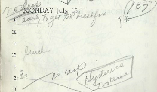 She had a “bad nite” and “GR home very late”, she weighs only a hundred pounds but she’s skipping meals and Gene is gone again all day. I’m getting out of sequential order here, but here is the other mention of her “hysterics” on July 15. She had no sleep and no nap, is overtired and gets hysterical.