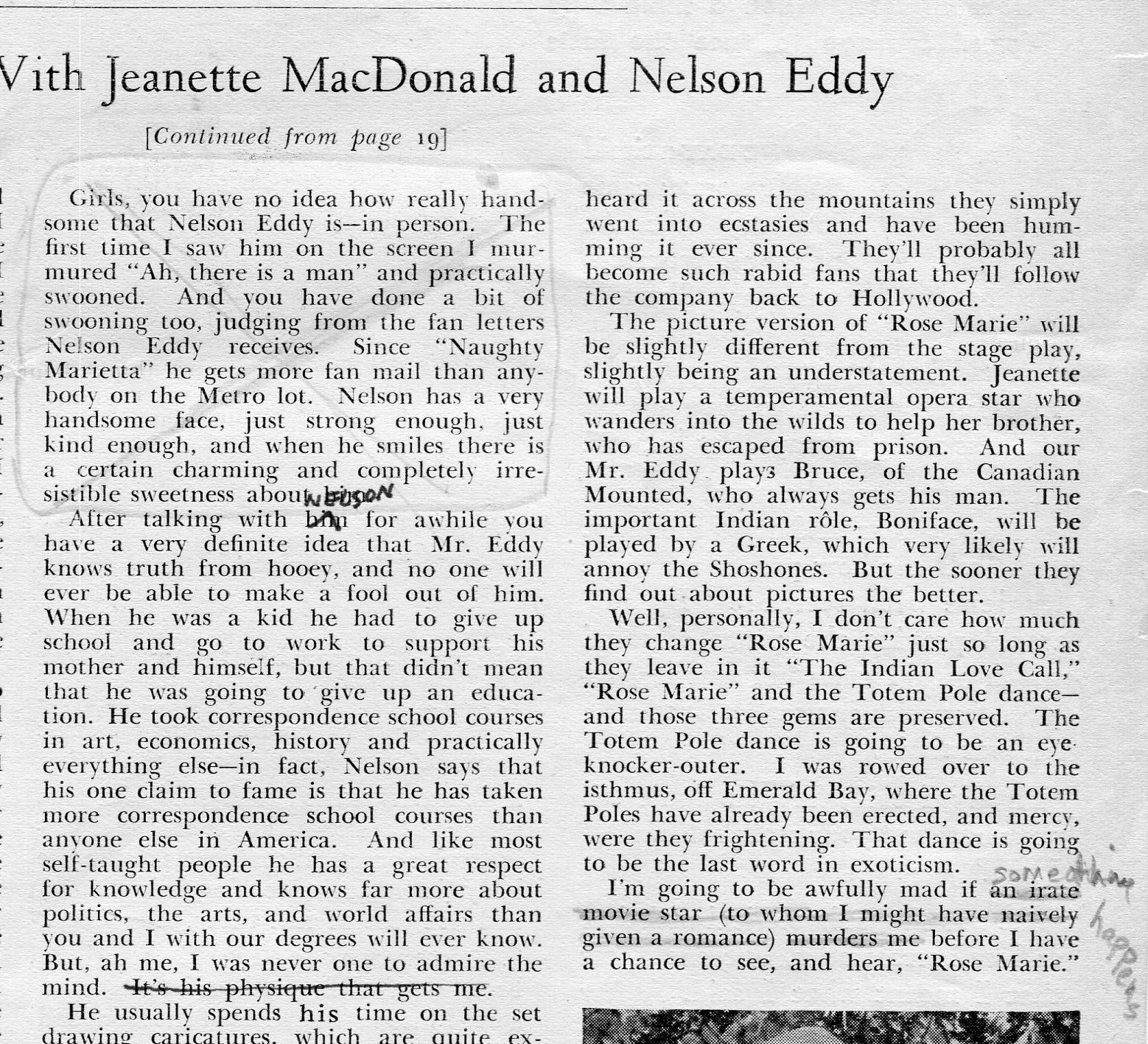 My research buddy Angela recently came across a couple of really interesting documents. (She also had the brilliant suggestion for the title of this post, so thanks, chum). The first is an article from the Rose Marie era, which was preserved by Clara Rhoades, JMIFC President, and was included in a pile of stuff that had been used for the club’s publication, The Golden Comet. This is just one example, but it’s hilarious and enraging all at once, of how these people edited an article that was, at the time, already like twenty-five years old, removing any reference that showed Nelson in a good, sexy, attractive, masculine light. Here is a part of the article that have been marked up by Clara before the thing was re-printed by her club. (The article is from Silver Screen magazine, December, 1935, and it is entitled: On Location with Jeanette MacDonald and Nelson Eddy.)