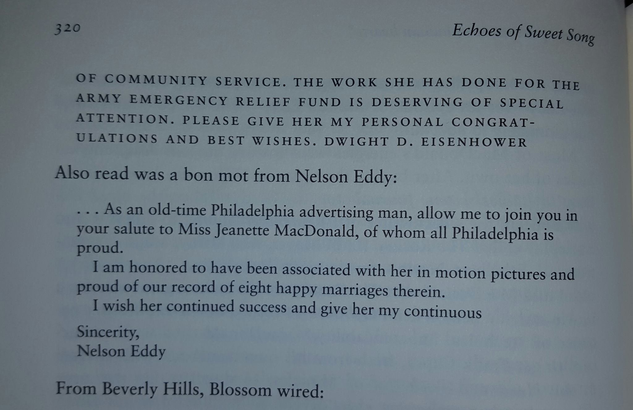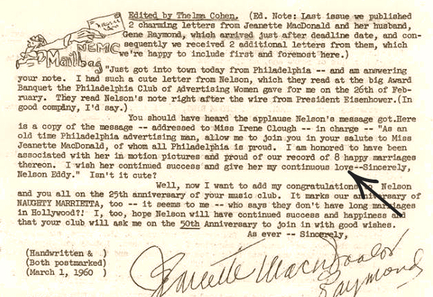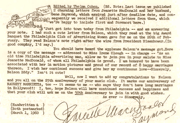 A letter from Jeanette was included shortly thereafter in the “Mailbag” section of the Nelson Eddy Music Club’s publication, in which she quotes what Nelson said in his letter. After looking for most of the day, I finally found my copy of this and have included the selection in question below: