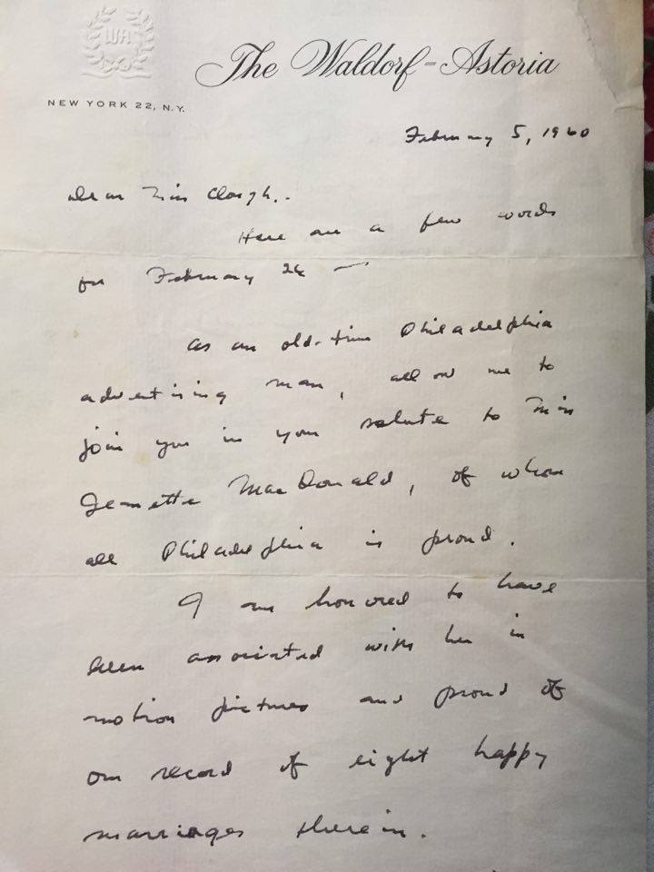 Now, as most of you know, Jeanette was given a Woman of the Year award in Philadelphia, February 26, 1960. Among the accolades and tributes of the evening, President Eisenhower sent a warm telegram to be read to the audience, and Nelson dashed off a letter as well with a tribute of his own.