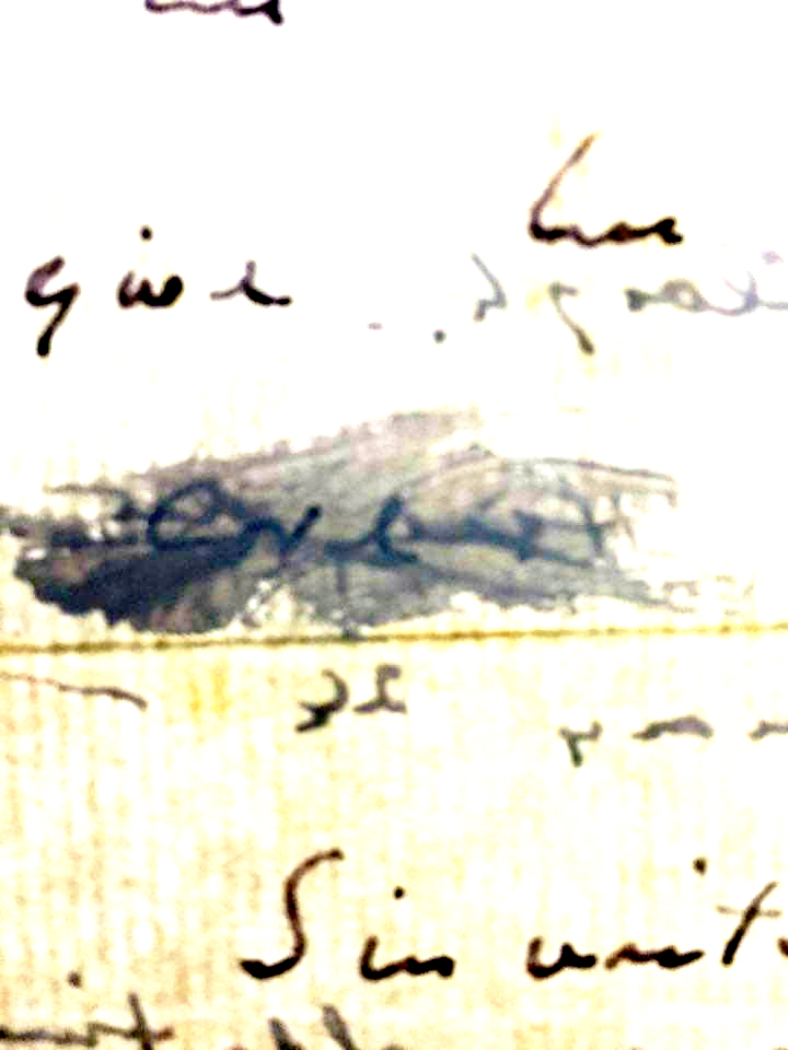 And just in case you don’t think the word “love” and a “&” symbol is under there, I asked Angela to take a flash photo of it. She reports that it’s plainly visible when holding the letter up to the light. I adjusted the contrast in the photo for the clearest viewing.