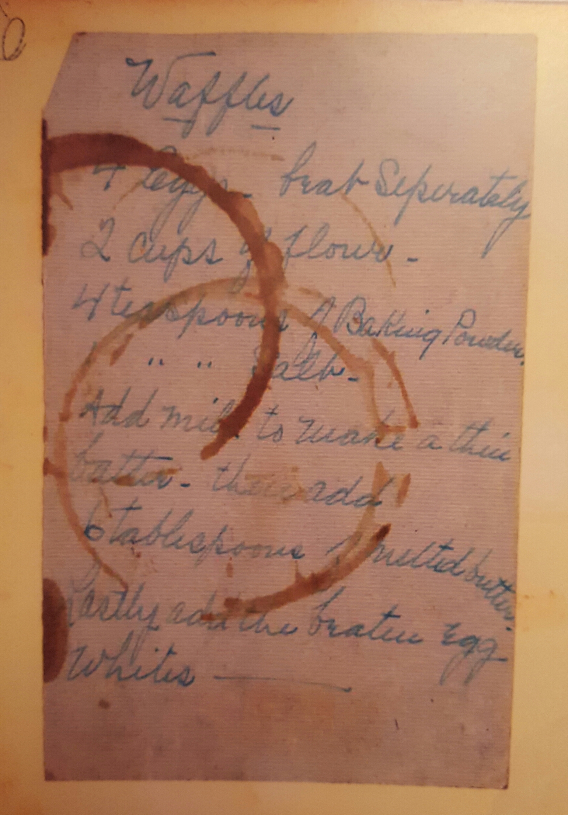 PLEASE NOTE: that is a 1 for number of teaspoons of salt!!! The brown ring on the old paper obscures it and her quotation marks then become misleading. Do not put 4 teaspoons of salt in the batter!