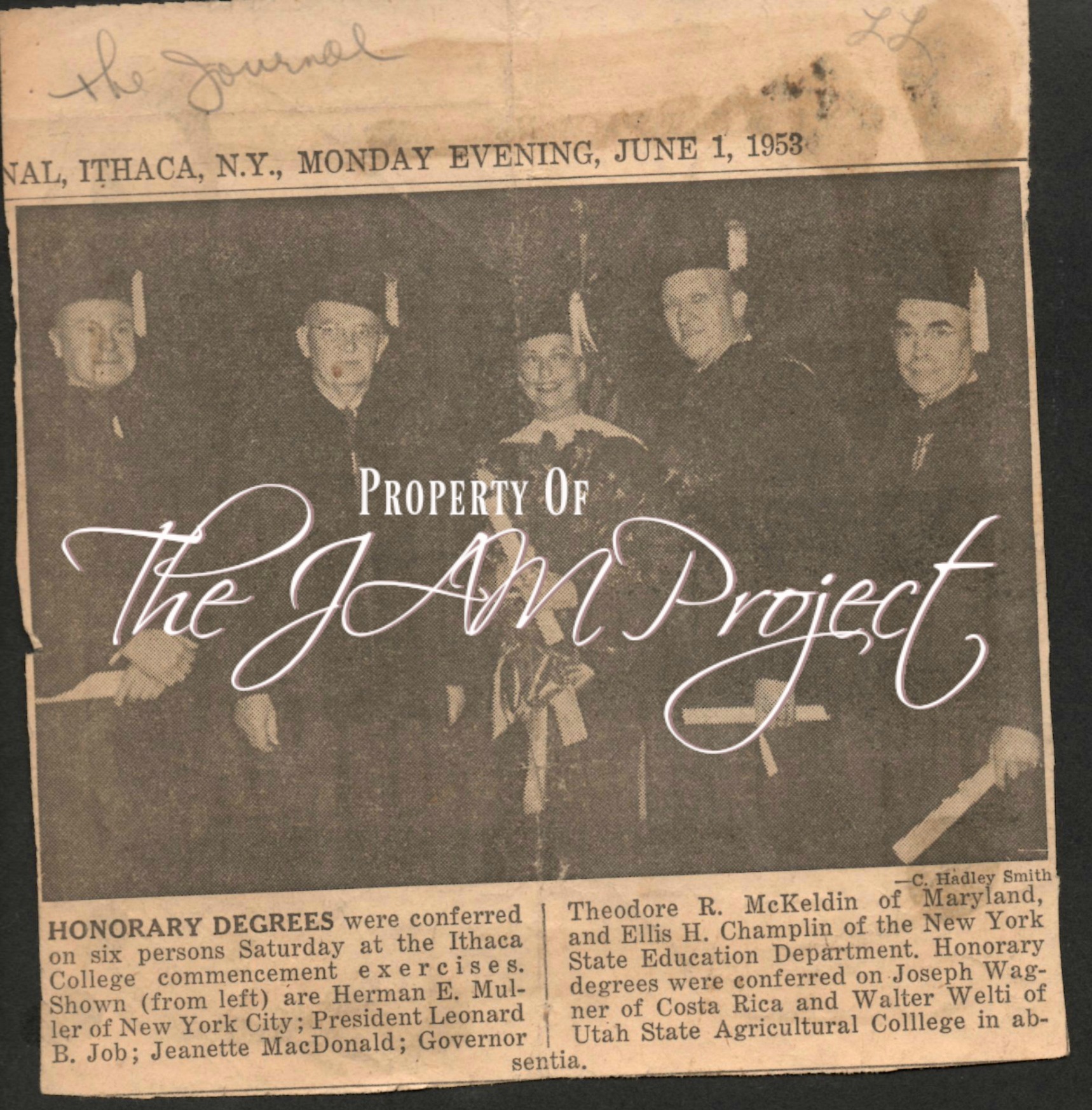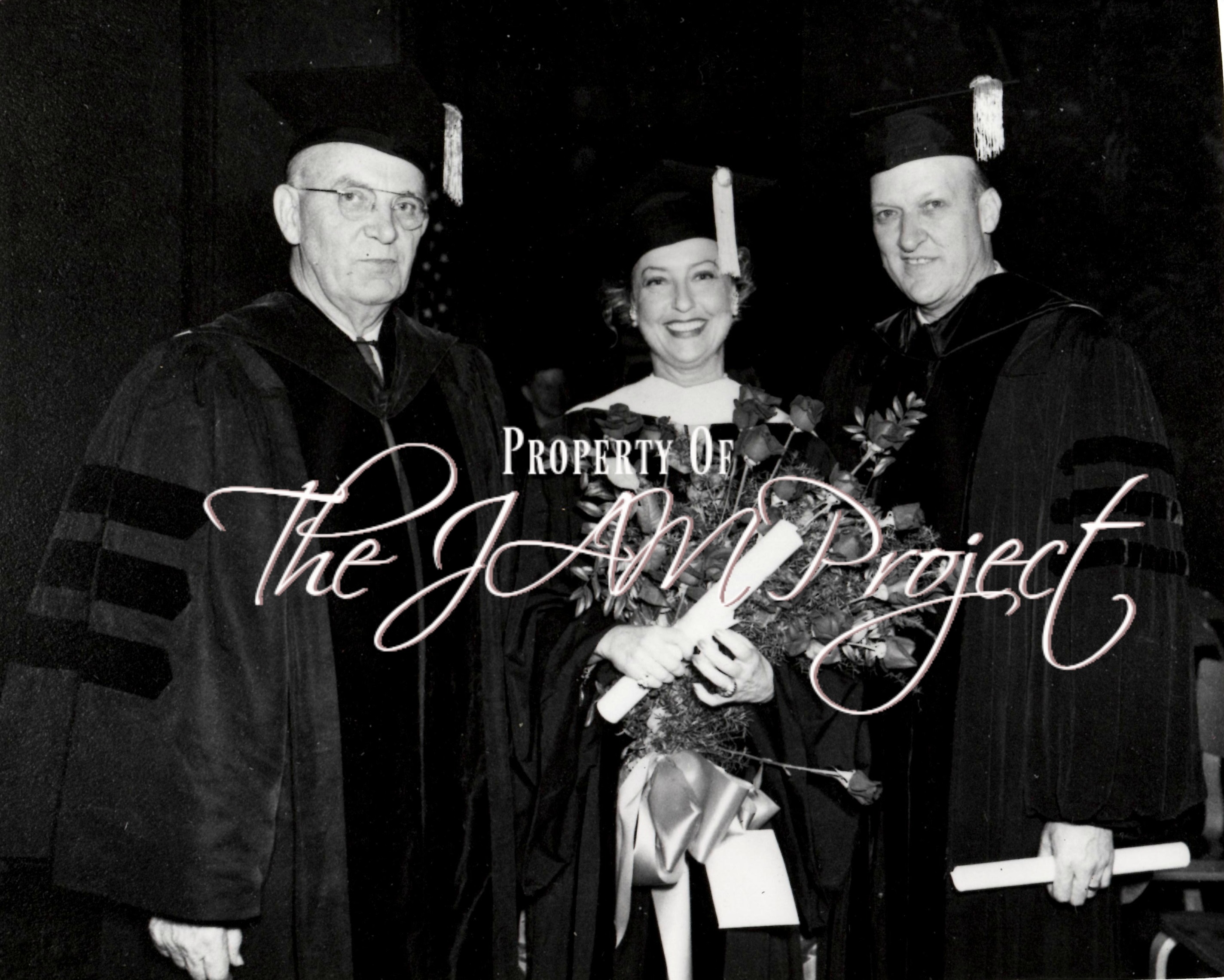 The day before graduation, Jeanette is photographed between President Job of Ithaca College and Theodore McKeldin, Governor of Maryland, who was also being honored.