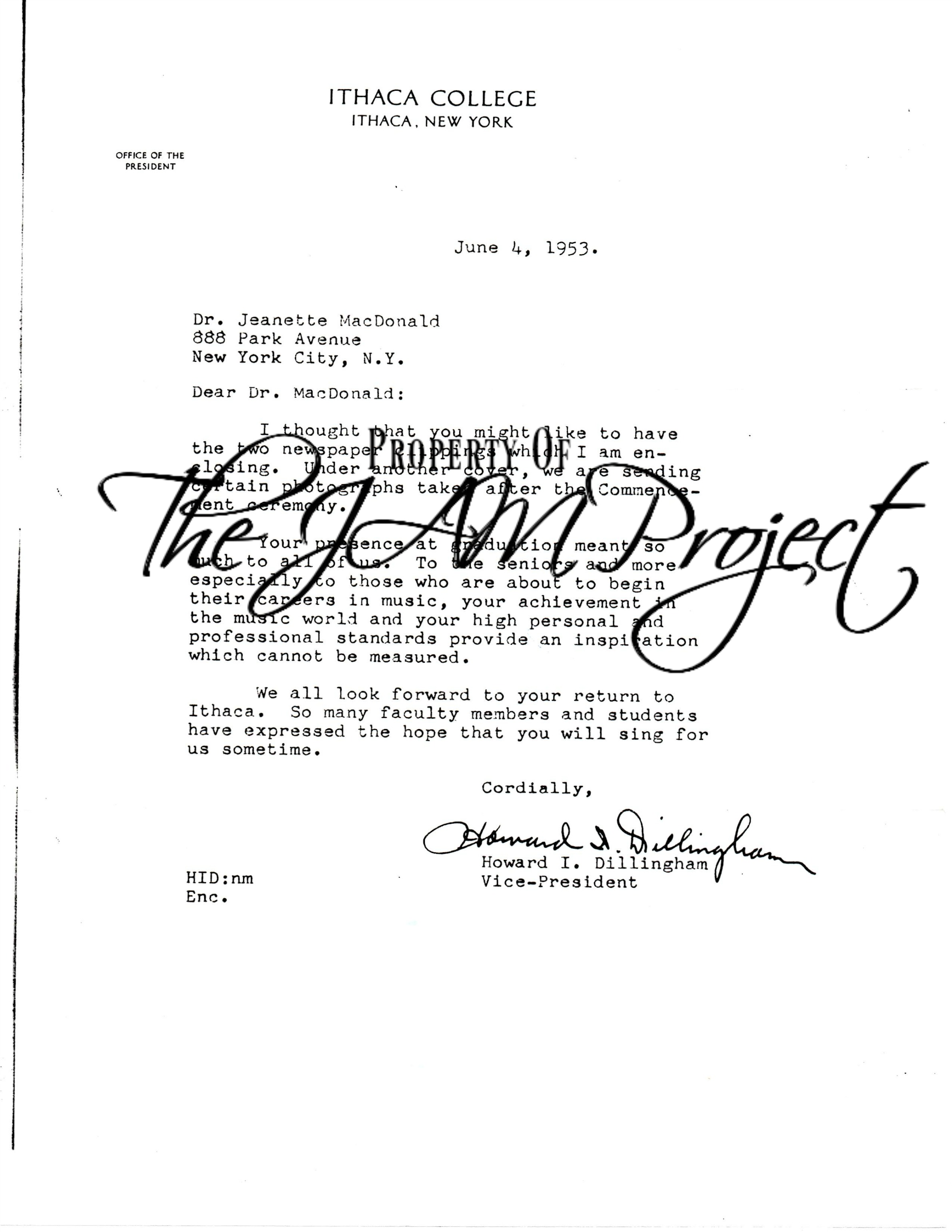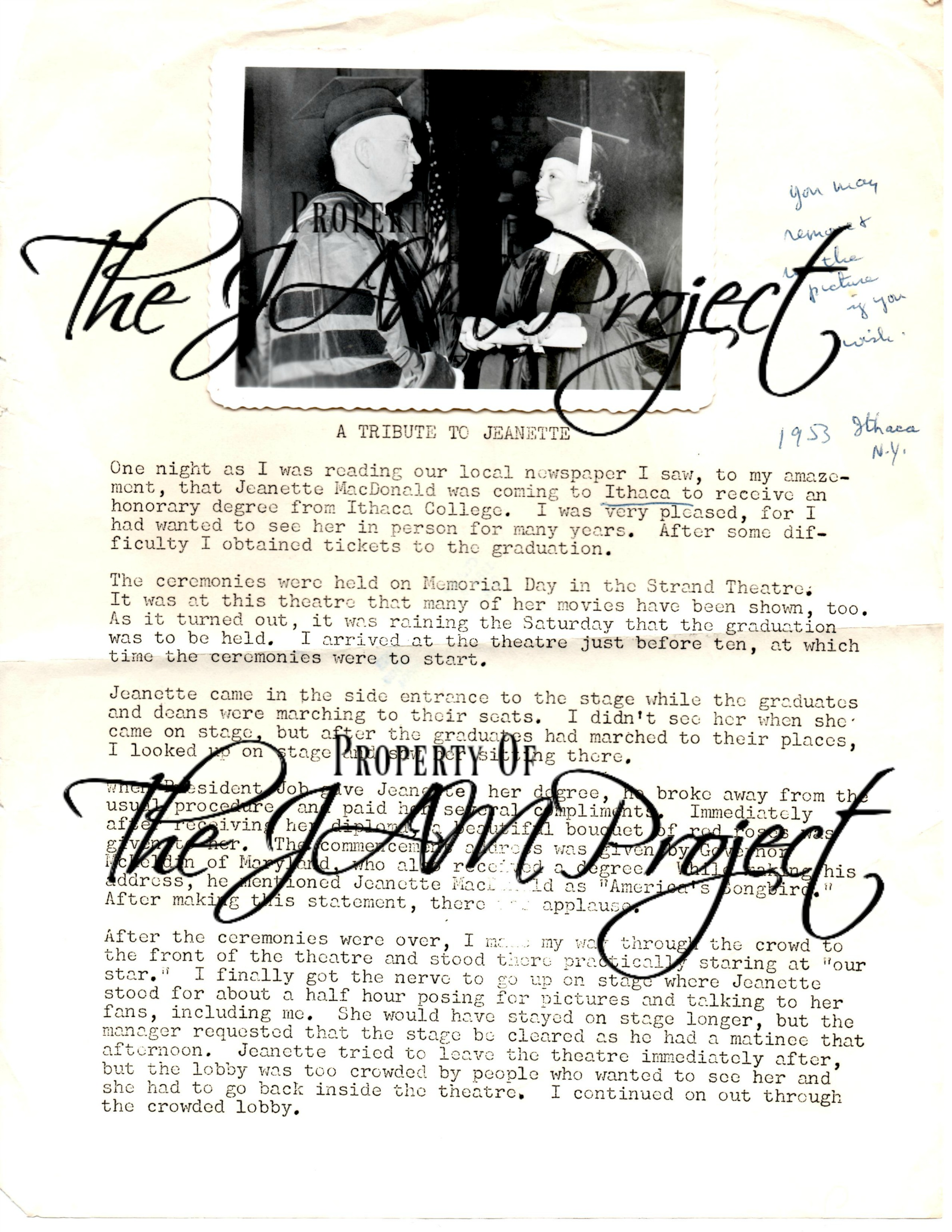 Above is a brief write-up of the event, which you should be able to make out through my unfortunate-but-necessary watermarking. Below is a mighty complimentary letter from the VP of Ithaca, adorably addressed to Dr. MacDonald. The letter accompanied the photos in this post when they were mailed to Jeanette.