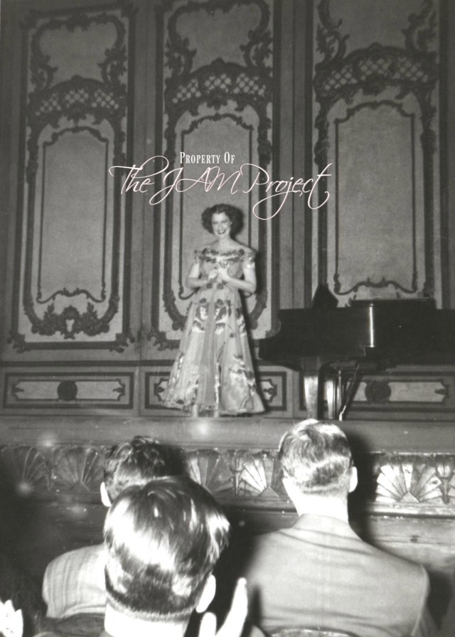 Jeanette onstage during the show, in the gown Shirley describes, after removing hat and gloves. Photo: Dorothy Spangler
