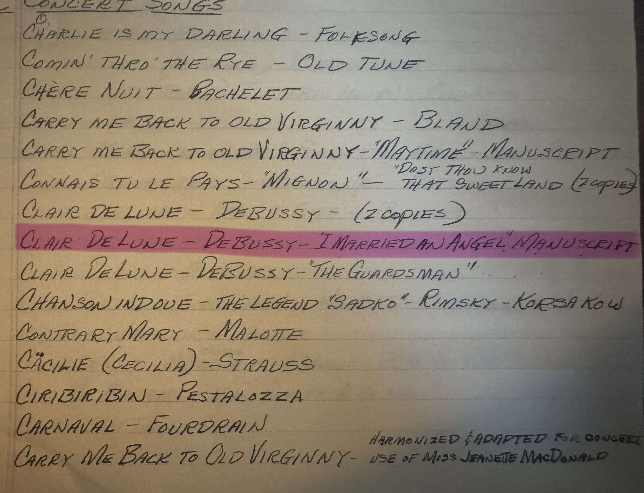 Welp, there’s her sheet music of it! (Note, I didn’t highlight on the actual pad, just on my phone’s photo of it.) Just a cute little connecting-the-threads moment, while looking for something else entirely.