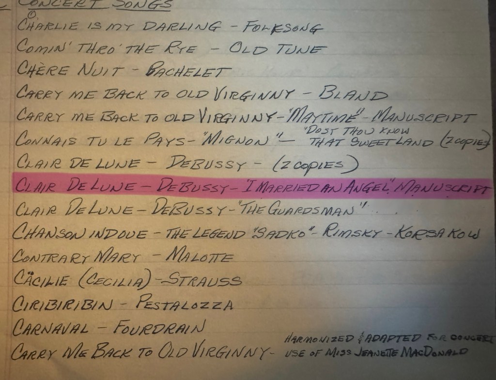 Word on the street was that Jeanette was going to perform Debussy’s Clair de Lune in I Married an Angel. If you will listen to my whispering in the recording, I mention that I’d just read a magazine article in which it was reported that Jeanette had recorded Clair de Lune on the piano for the picture. Ultimately, of course, this didn’t make the final cut — LOL there are so many things that didn’t make the final cut of that thing, am I right? (Well, I know I’m right; I have Jeanette’s script.) But this is credited to her, obviously under the direction of Herbert Stothart.